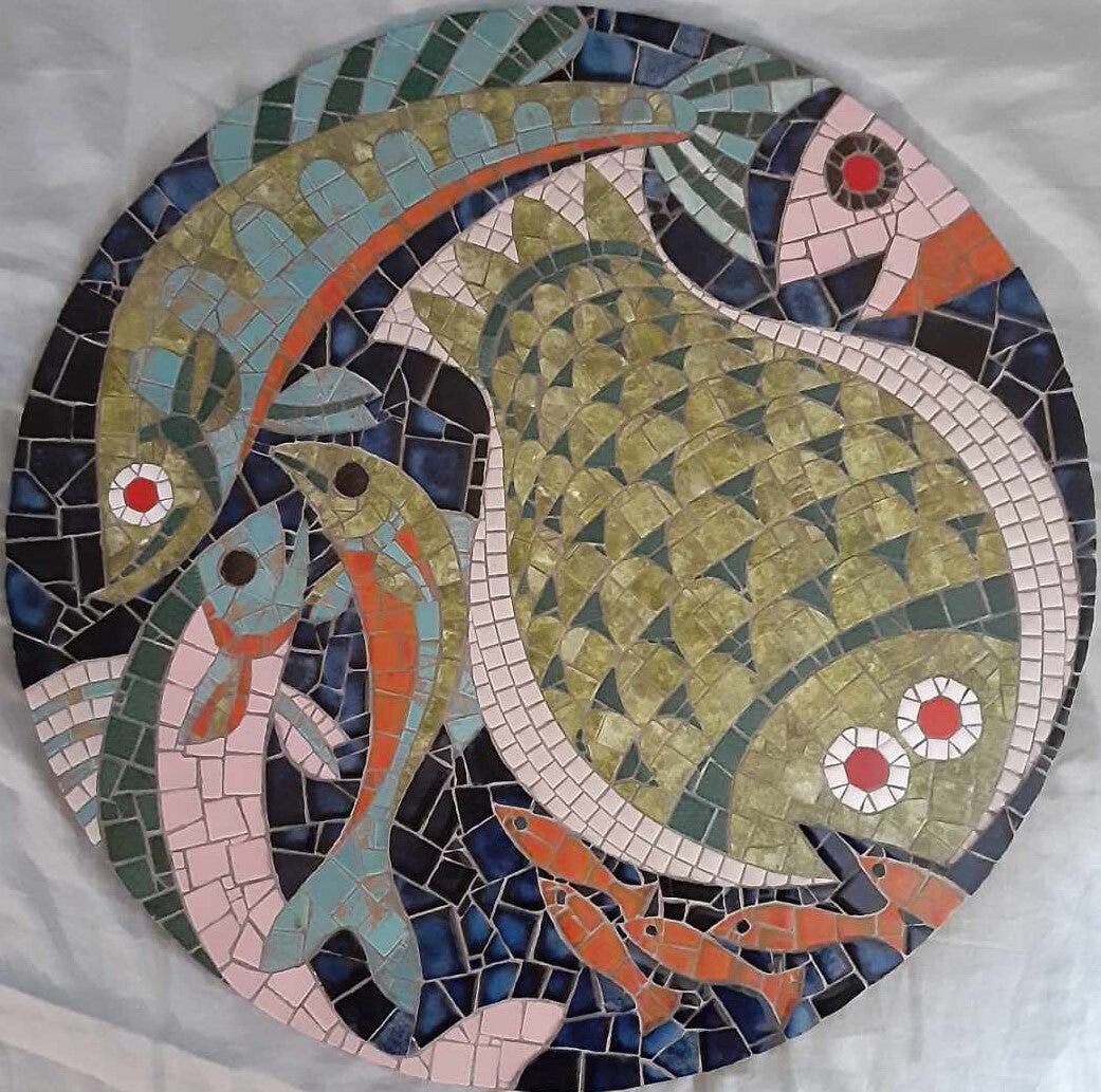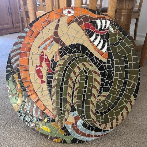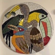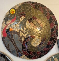 My dad also created mosaic "rounds" (about 2 1/2 feet across. He made hundreds of them and gifted them friends and family. I have created my own interpretation of them in a smaller Block Print.